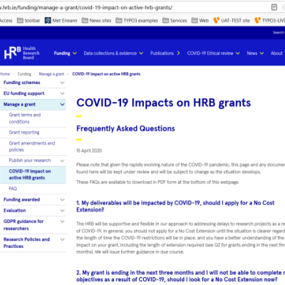 ‘We will keep the situation under review, and we would ask grant holders to bookmark the page below and to check in on it from time to time. We will, of course communicate any major changes through our normal channels, such as email to Principal Investigators, Research Offices, in addition to posting it on the HRB website and in the HRB ezine’.